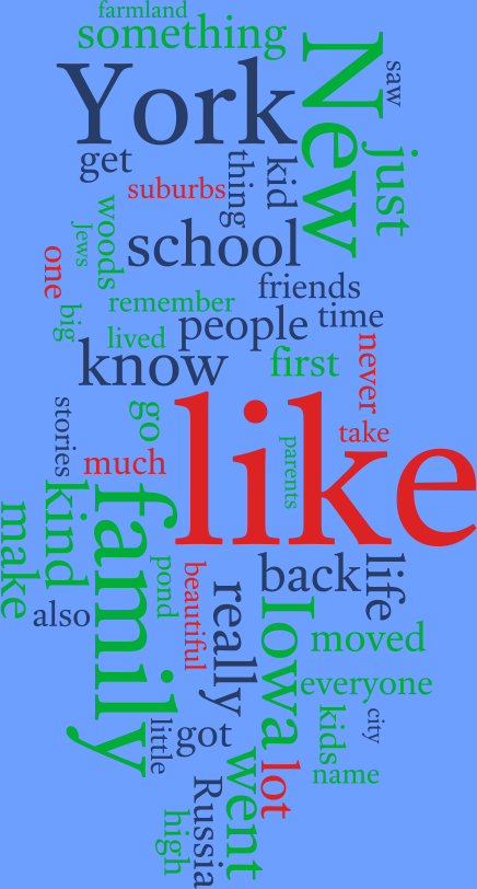 So, we flew to Iowa in a blizzard, in the year of 1980-81... I don't remember what year exactly... flew to Iowa, and we landed at night in this big snow storm, and we went out to dinner somewhere, and I remember so well -- the waitress came up to us, and she's like, "Hi! How are you tonight?" And my family just sat there, frozen. And I looked around this restaurant, and I was kinda scared, because all the people in the restaurant were blond, and my family were all dark-haired Jews. And I look around, and everyone has light hair, and I'm like, "Why is this woman being friendly to us? She doesn't know us!" She's like, "How are you today?" And I'm.... So, if you go in a restaurant in New York, mostly you get, like, "Hi, what do you want? C'mon, you want me to go back? I don't have all day. I can take your order now, but if you're not... if you don't know..." And here she's like, "Hi. How are you today?" I was so scared. I was such a scared fifteen year old kid, going, "Uhhh..."