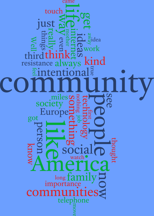 I look at, for example, the Anabaptist communities, like the Amish. And I see that they're leading a comfortable life in community, because they're refused certain forms of technology. They don't have telephones in the house, because they feel that that would get in the way of the physical aspect of their community. And every piece of technology that they've thought about -- I studied the history -- they've thought about not because "God said that telephone were evil", it's because with telephones, their community would start to fall apart. They saw that very clearly in 1907, when they decided not to use telephones. If they had cars, this would mean that they could live apart from each other, instead of next to each other. So they decided not to have cars. Because their prime value was community, and the chance to lie what they considered an authentic life. Now, for them, that means some kind of Protestant fanaticism I'm not terribly attracted to! But I do admire them because they're the only true Luddites that I see. They're the only people who have realized the connection between the social and technology, and done something about it. So, that's the gist of my answer about the importance of these communities.